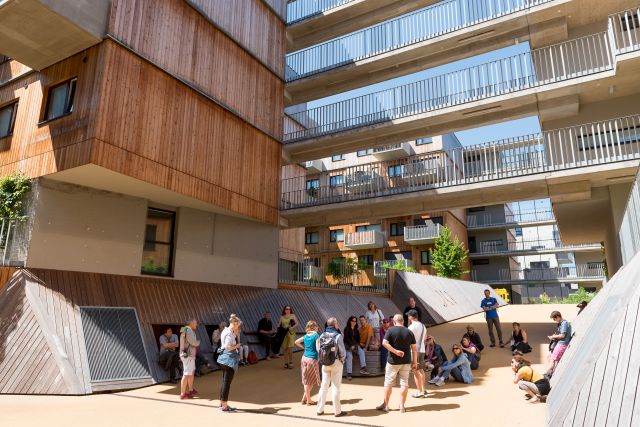Die architektonisch vielfältigen, städtebaulich sehr durchdachten Bauten auf dem Gelände des einstigen „Kabelwerks“, auch dort mit einem eindrucksvollen Pool auf dem Dach, hatten einen anderen Fokus: Das Gebiet wurde in einem konsortialen Planungsprozess mit starken gegenseitigen Abhängigkeiten und Kooperationen der verschiedenen Bautätigen entwickelt. Nicht zuletzt in diesem gemeinsamen Prozess konnten sehr dichte, qualitätsvolle Öffentliche Räume entstehen, die einer nachbarschaftlichen Nutzungslogik folgen. Die Gebäude werden auch gemeinsam vor Ort verwaltet – gerade für die Bewohner ein großes Plus.